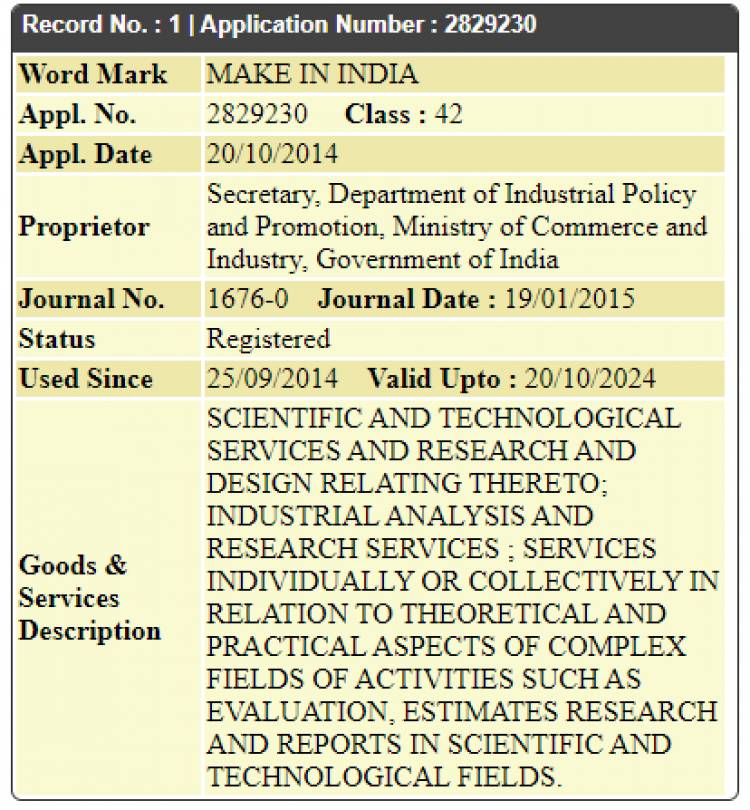 The registration of the logo was sought in the application bearing the number 2829230 under multiple Classes i.e. 9, 16, 18, 25, 28, 35, 38, 41, and 42. The logo is registered as a device trademark. The registered proprietor of the trademark is Secretary, Department of Industrial Policy and Promotion, Ministry of Commerce and Industry, Government of India.